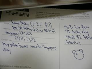 not going to put up the one i sent to masi oka cos i doubt it will reach and i had my address on it. if postmen start knocking on my door one day, i will definitely inform you what happens :)